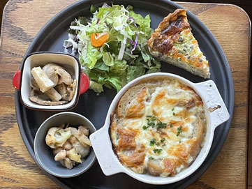 焼きたてキッシュ&その日の野菜惣菜と小さめのチキンオンザライス